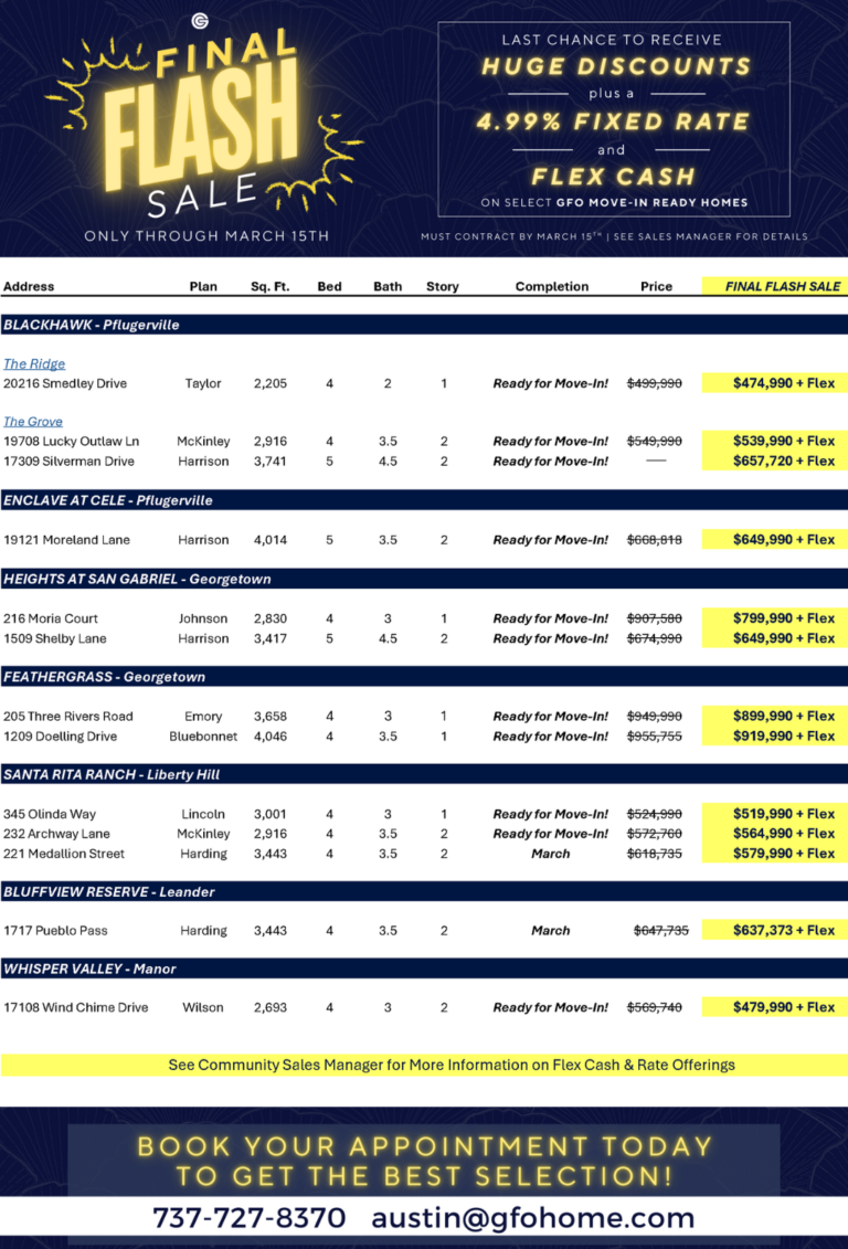 *Promotion valid on accepted contracts for select move-in ready inventory homes dated 2/27/2026-3/15/2026 that close by March 31, 2026. Not all homes are included in this sale or promotion. Promotion, rate, and flex cash amounts are subject to conditions and vary per community and home. Promotion valid only on select move-in ready inventory homes that meet closing requirements including but not limited to closing with Capital Title and use of GFO Home LLC preferred lenders. Offer may not be redeemed for cash, equivalent and does not apply to contract transfers, cancellations, or rewrites. GFO Home reserves the right to modify or cancel promotions at any time. Interest rate promotion is valid on select inventory homes only through GFO Home LLC preferred lenders and may not be included on all homes in this sale. *10/6 ARM on conforming loan amounts. Does not apply to jumbo loans. Rates provided 11/1/2025. Stated rate may change or may not be available at time of rate lock. Based on FICO score of 780. Example: Purchase Price $600,000, 20% Down Payment, $480,000 Loan Amount, 30 year term, initial interest rate 4.99% (5.835%APR) for initial 120 payments of $2,574, not including taxes and insurance. Loan eligible for no lender fee refinance for up to 5 years and after 6 months of closing when closing with GFO Home LLC and preferred lender only. See a GFO Home sales representative for details.